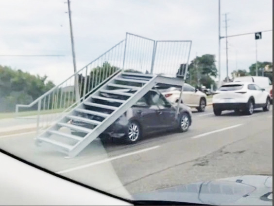 Peel Regional Police were deluged with calls about a car driving the Queensway with a set of metal stairs attached to her car. The callers reported the steps were a ladder or a truck with stairs from the airport even the remains of any earlier airplane incident. Officers saw the car moving slowly in the traffic because the road was under construction and there a number of vehicles moving slowly through the intersection. The office did a U-turn at the next crossing and caught up with the woman. Smashing her car into the stairs had deployed her airbags which further made driving challenging.