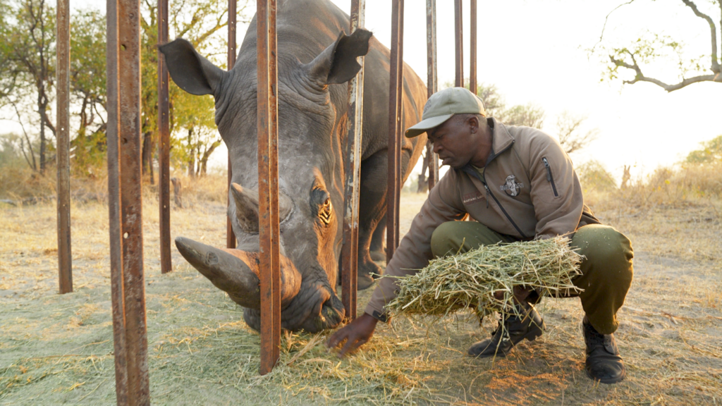 A Florida zoo team recently traveled to Zimbabwe after they were asked to help a white rhino suffering from a parasitic eye infection. They came up with a “ridiculous idea” to corral the wild animal, earn its trust as if it were a horse or dog, and administer eye drops. It took place outside of Hwange National Park, where a special project called the Community Rhino Conservation Initiative was ongoing to reintroduce members of the southern white rhino subspecies onto communal lands to give locals a stake in the animal’s future. Palm Beach Zoo CEO Margo McKnight was visiting the area in August of last year when she was alerted to a problem and asked to help: a male rhino named Thunza seemed to be on the verge of scratching himself blind. The zoo was asked to help save the eyesight of Thunza, a male southern white rhino suffering from a life-threatening parasitic eye infection. Thunza has great protection on communal lands thanks to our friends at Imvelo Safari Lodges.