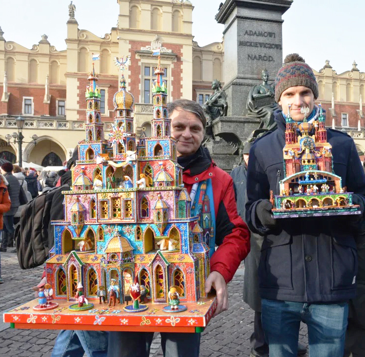 Nativity scenes come in all shapes and sizes: (as illustrated in the video below) they might be life-sized, using actors to represent the protagonists, or they might be tiny wooden scenes made to display in a living room. Nativity scene makers taking part in competitions create their works over many months, reproducing in detail the rich architecture of Krakow. However, their nativity scenes are a product of the creator’s imagination and a stylistic mix.