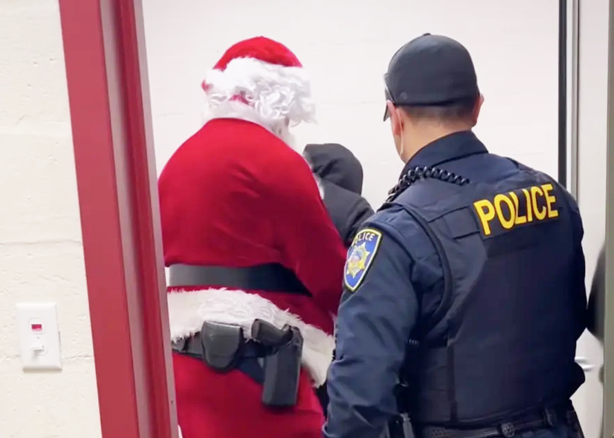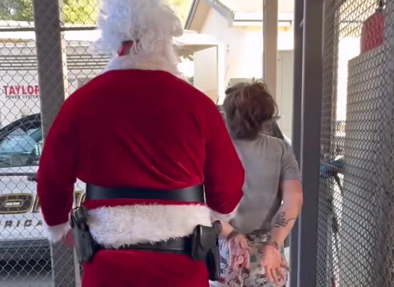 So Santa, carrying a 9MM under his red suit when he came to their house and asked to “Check their chimney” kind of. Along with a couple of full sized, blue suited helpers. They checked the garage and the pickup truck and “Bless my soul” they found the trees and the unopened crates of wreaths. It seems Santa’s elves have security cameras that can even read license plates. So there really wasn’t much of mystery about these bad boys and girls. The video below, posted to Facebook, is set to the soundtrack of “You’re a Mean One, Mister Grinch.” It did make good TV though to see Santa taking Joshua Gonzales and Kayla Daniels in handcuffs, to the North pole of Southern California. On suspicion of grand theft and conspiracy. The heist had retail value of $2400.