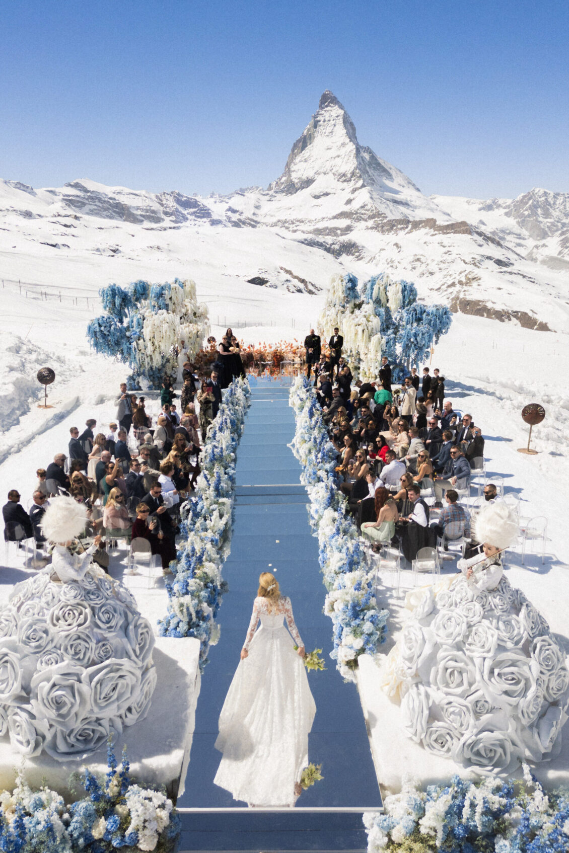 An unidentified couple, with an obvious substantial budget, had their wedding on a Swiss mountain top looking up at the Matterhorn. Putting on a wedding nearly 9200 feet above sea level presented logistical challenges, made even more complex by sub-zero temperatures. Zermatt’s car-free restrictions required over 40 tons of materials and 55,000 delicate flowers to be transported via helicopters and electric vehicles. When storms destroyed a significant portion of the inventory three days before the wedding: team members working 18- to 20-hour shifts and battling numbing cold, their resilience, and ingenuity ensured every setback was met with a solution. Tehiya Inc. and her team’s leadership, dedication, and quick thinking transformed the couple’s ambitious vision into an extraordinary reality. The guests were treated to frozen drinks served encased in ice cubes with every detail frozen to perfection and serenaded by musicians who rose on platforms to be giants from the snow in brilliant colors. The aisle, a pristine snow pathway adorned with delicate white flowers sculpted from ice, added a touch of whimsy and magic to the ceremony. The highlight of the event was the appearance of the bride encased in a large ice cube. To be rescued from the massive ice prison by her Scotch suitor.